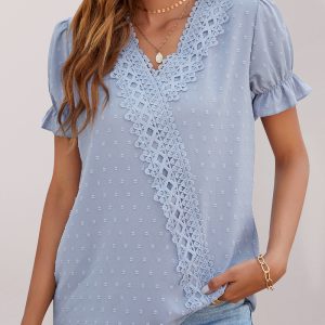 Women’s woven V-neck polka-dot jacquard chiffon lace short-sleeved shirt