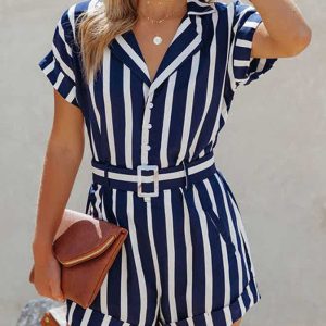 Women’s Woven Stripe Short-Sleeve Lapel Casual Rompers