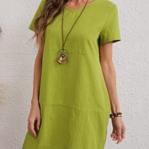 Women’s Woven Solid Color V-Neck Short Sleeve Dress