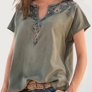 Women’s Woven Western Ethnic Style Loose Short Sleeve Top