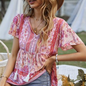 Bohemian Print Casual Resort Style Short Sleeve Ladies Top
