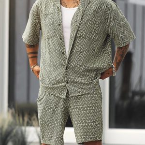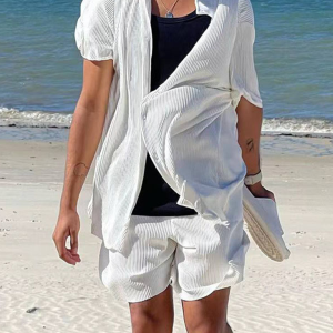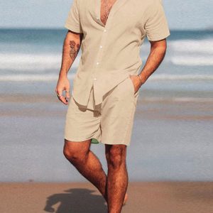 Men’s casual loose beachwear solid color striped short-sleeved suit