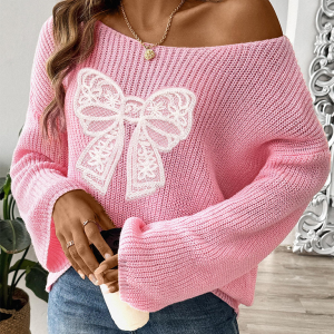 Bow Embroidery Applique Women’s Pullover Sweater One Neck Strapless Flare Sleeve Sweater