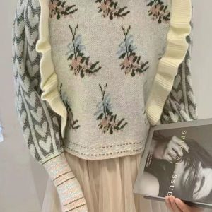 New round neck jacquard ruffle splicing short pullover contrast color sweater