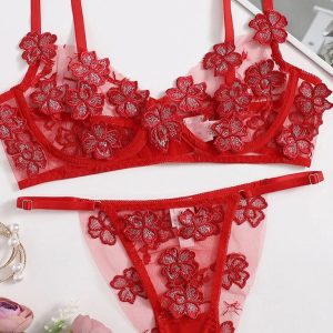 New sexy and sweet mesh embroidered flower appliqué bra set